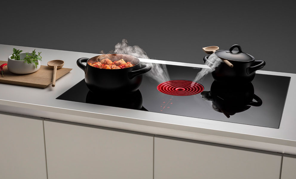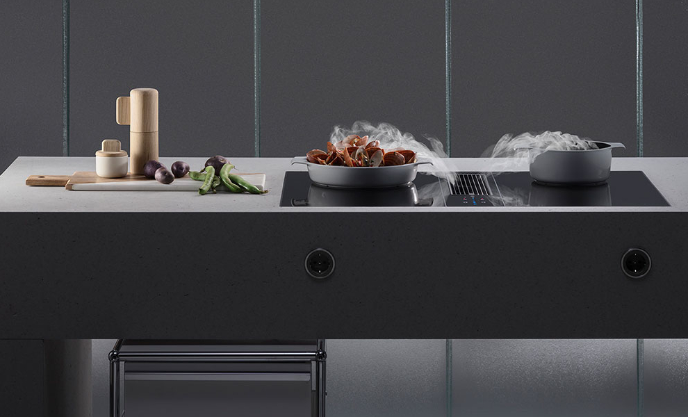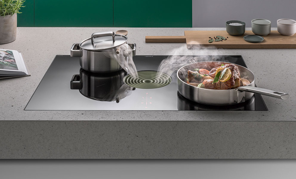 PHYSIK KANN SO SCHÖN SEIN. Kochdünste und -gerüche lässt BORA gar nicht erst hochsteigen, sondern saugt sie dort ab, wo sie entstehen: direkt am Kochfeld, direkt aus Topf, Bräter, Pfanne, Grill. Das ist keine Zauberei, sondern angewandte Physik gemäß den Grundprinzipien der Strömungslehre. Dazu wird ganz einfach eine Querströmung genutzt, die größer ist als die Steiggeschwindigkeit des Kochdunstes.