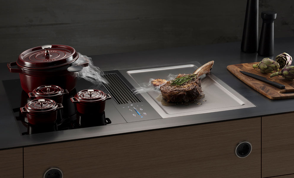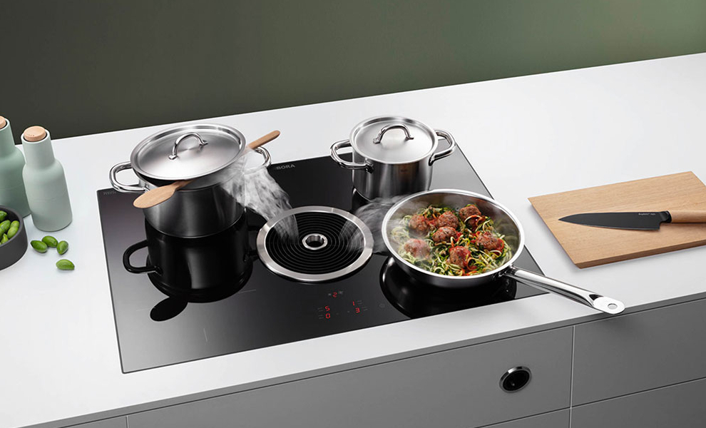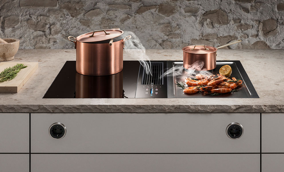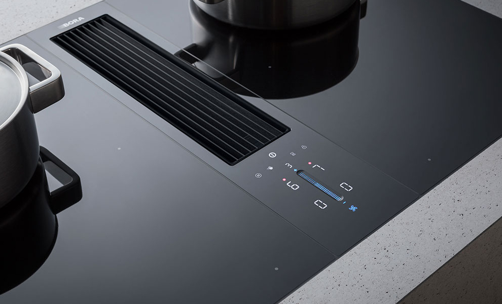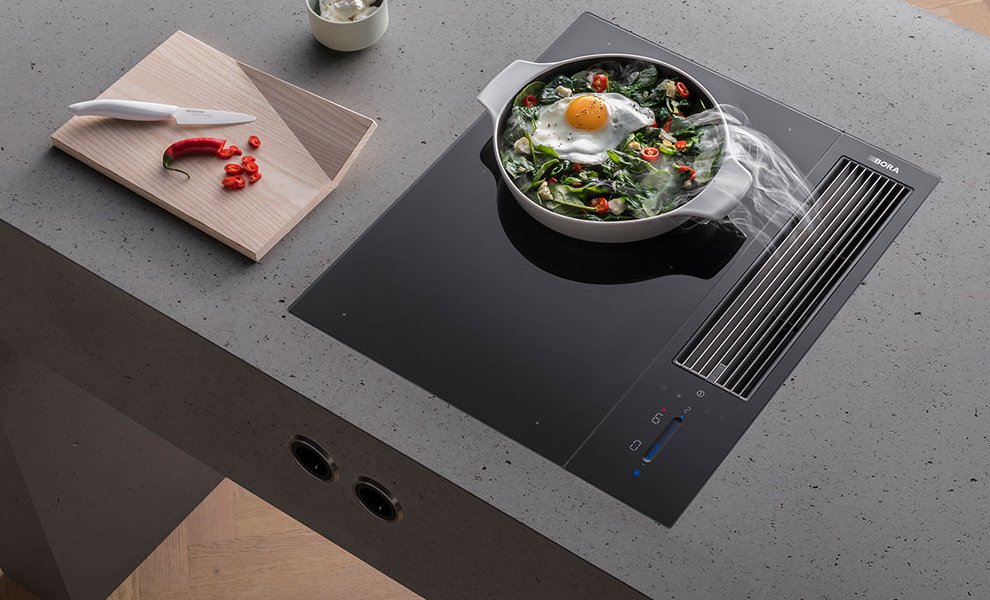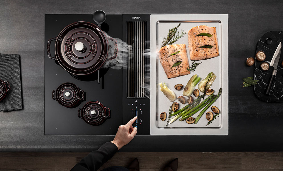 PHYSIK KANN SO SCHÖN SEIN. Kochdünste und -gerüche lässt BORA gar nicht erst hochsteigen, sondern saugt sie dort ab, wo sie entstehen: direkt am Kochfeld, direkt aus Topf, Bräter, Pfanne, Grill. Das ist keine Zauberei, sondern angewandte Physik gemäß den Grundprinzipien der Strömungslehre. Dazu wird ganz einfach eine Querströmung genutzt, die größer ist als die Steiggeschwindigkeit des Kochdunstes.