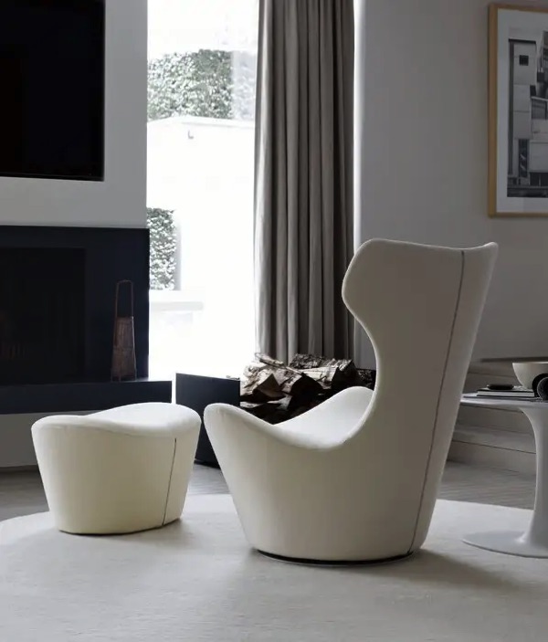 Grande Papilio ist mit Stoff- oder Lederbezug erhältlich, drehbar gelagert und kann mit einem passenden Fußhocker ergänzt werden – für entspanntes Zurücklehnen und maximalen Komfort. Als ikonisches Design hat Grande Papilio zudem eine ganze Familie inspiriert, darunter weitere Sitzmöbel und ein Bett.