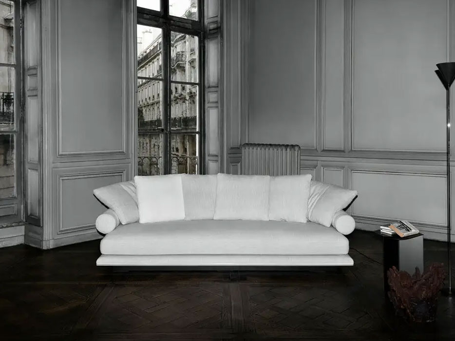 Ein prägendes Detail ist das variabel positionierbare Rollenpolster – nutzbar als Armlehne, Nackenstütze oder Abschluss. Grundlage des Systems sind vier Formen: quadratisch, rechteckig sowie die organischen Varianten „a pianoforte“ und „a vela“. Ein umlaufendes Aluminiumprofil (verschiedene Finishes) betont die Kontur. Erhältlich in Stoff oder Leder.