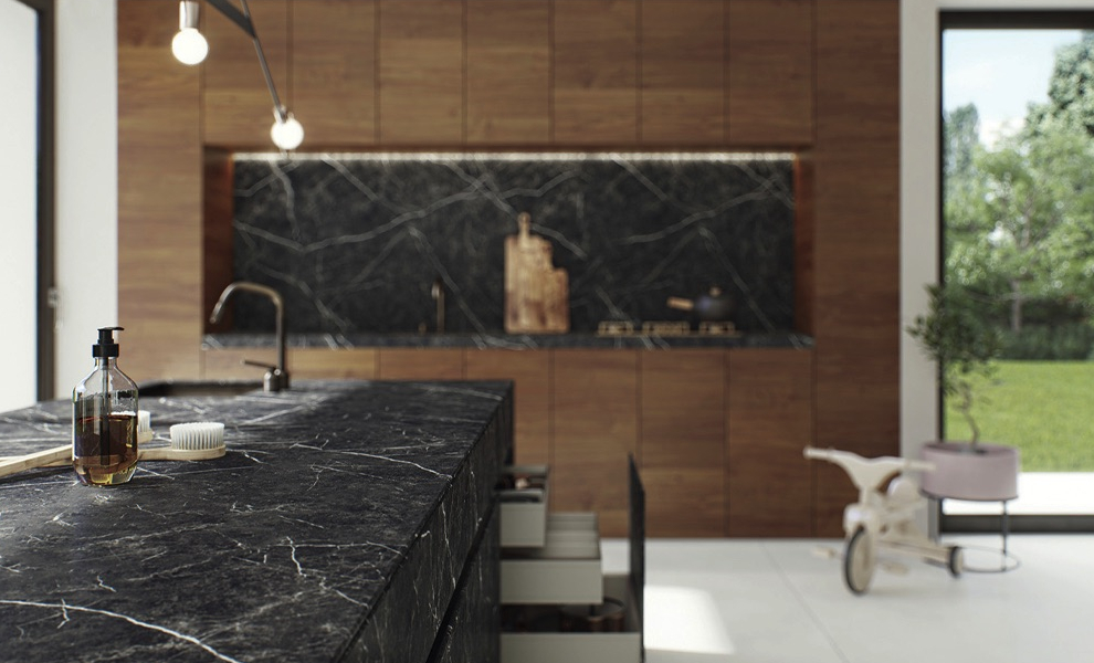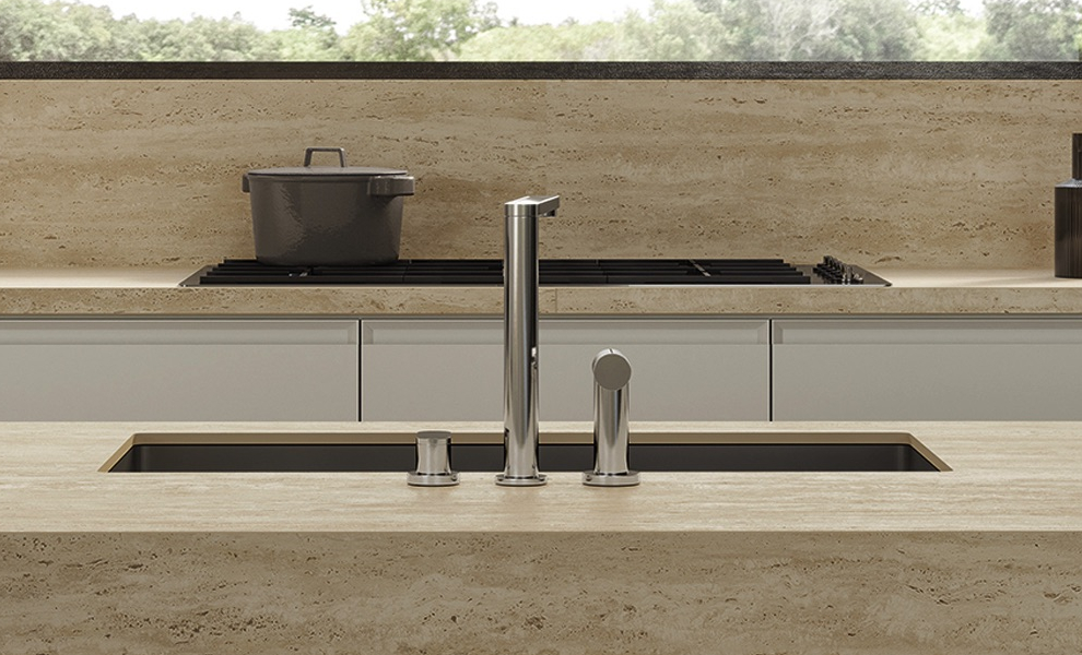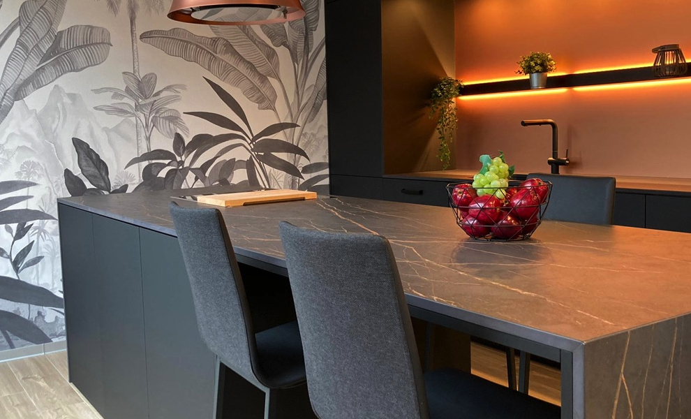 Dekton ist in zwei Oberflächenausführungen erhältlich: matte (gebürstete Satin-) und X-Gloss Hochglanz (poliert). Beide verleihen der Küche eine unterschiedliche Optik, bieten aber die gleichen praktischen und hygienischen Vorteile.
