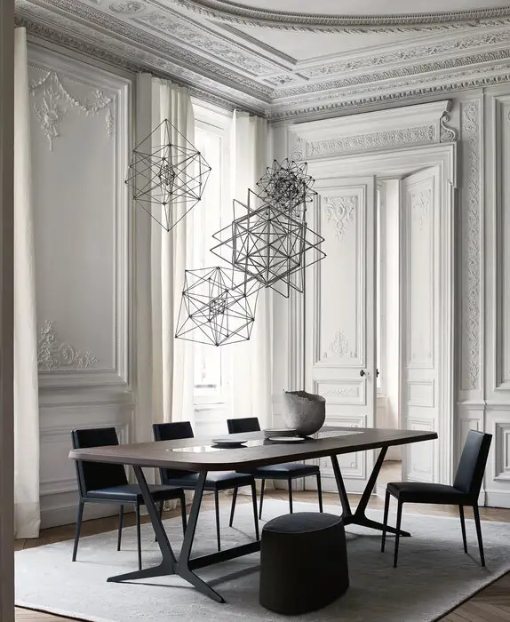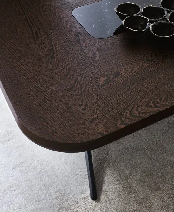 Besonders prägnant ist der dreieckige Querschnitt der leicht geneigten, vom Boden angehobenen Stützen – ein Detail, das dem Astrum eine elegante Leichtigkeit verleiht und gleichzeitig hohe Stabilität garantiert. Für die Tischplatten stehen edle Materialien und Oberflächen zur Auswahl, darunter Holz, Lack und Marmor. Bei den runden Versionen kann zusätzlich ein drehbares Tablett (Lazy Susan) integriert werden – ideal für gesellige Dining-Situationen mit maximalem Komfort.