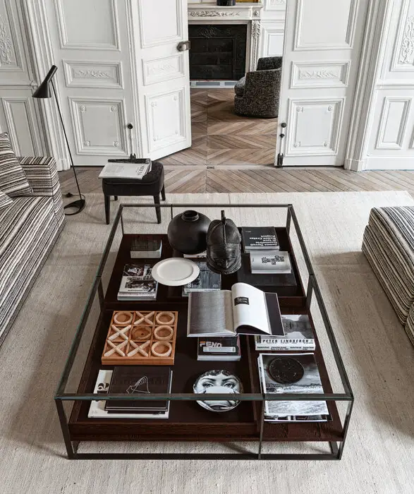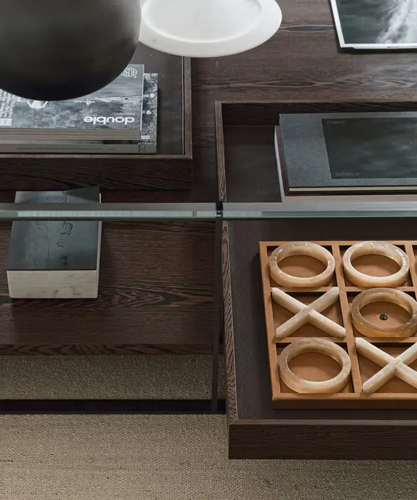 Erhältlich in zwei Größen, kombiniert Lithos eine transparente Glasplatte mit einem fein gearbeiteten Metallrahmen in edlen Lackfarben. Die mittlere Ablage sowie die ausziehbaren Tabletts bestehen aus Holz und sind in verschiedenen Oberflächen erhältlich. Besonders exklusiv: Die Tabletts sind mit Leder in Colonial- oder Dunkelbraun bezogen. Ergänzt wird die Serie durch quadratische, rechteckige und runde Couchtische – wahlweise mit Marmorplatten in unterschiedlichen Farbtönen oder mit Holzplatten in Lamellenoptik mit oberer und unterer Ablagefläche.