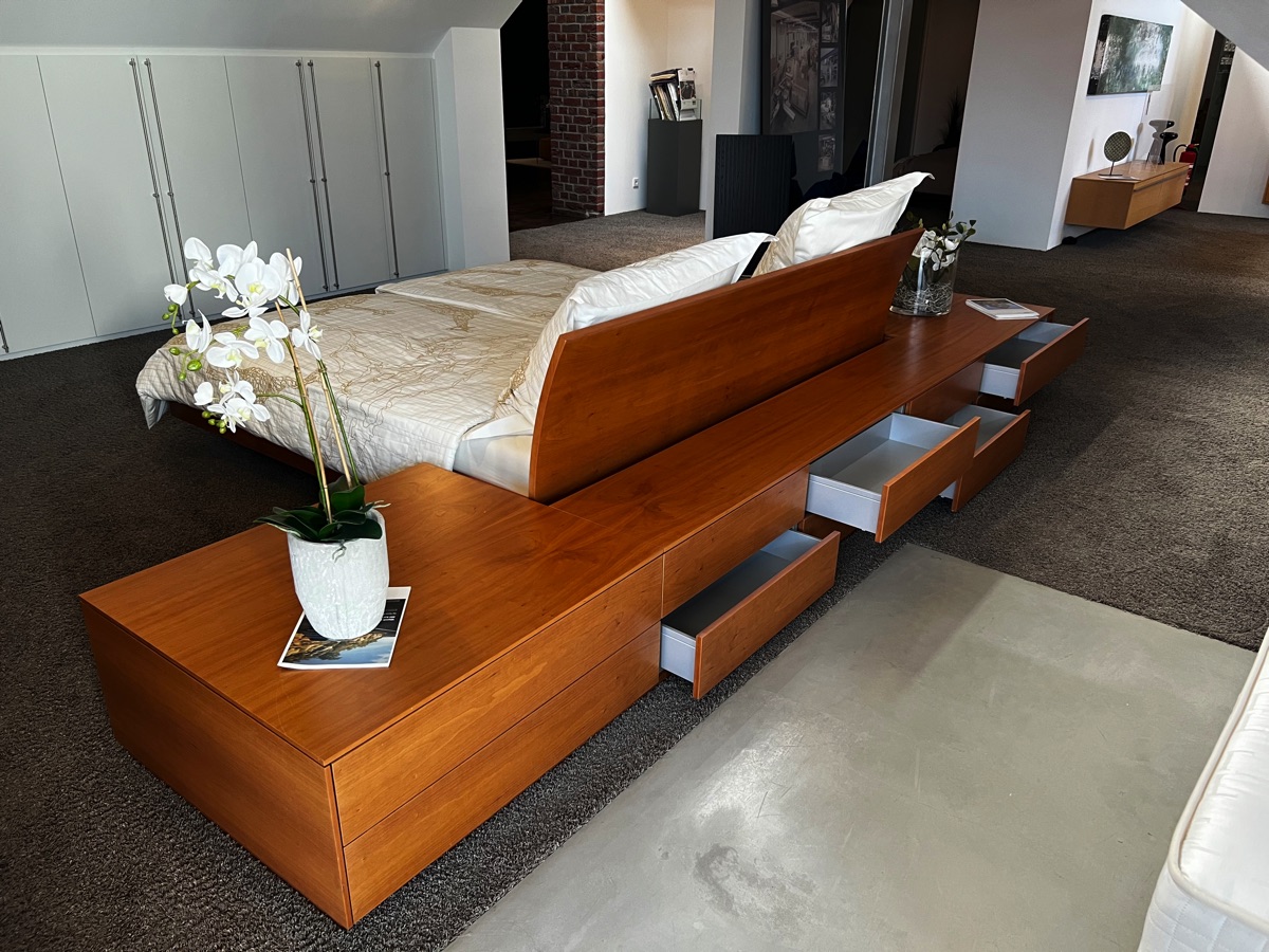 Ein luxuriöses Ensemble in warmem amerikanischem Kirschbaum, veredelt durch feine Edelstahl-Applikationen. Das Bettmodell 2500 begeistert mit einer sanft gerundeten Rückwand und eleganten Proportionen. Ergänzt wird es durch zwei Nachtkommoden und ein harmonisch abgestimmtes Sideboard.