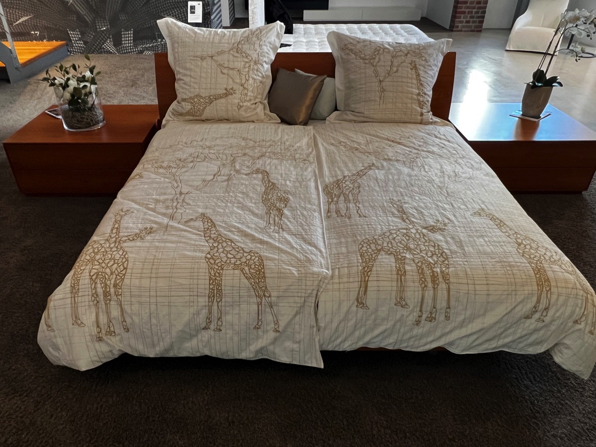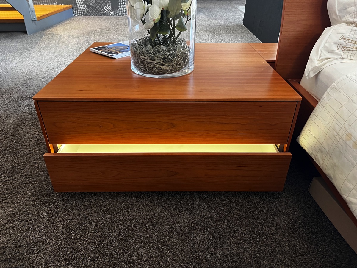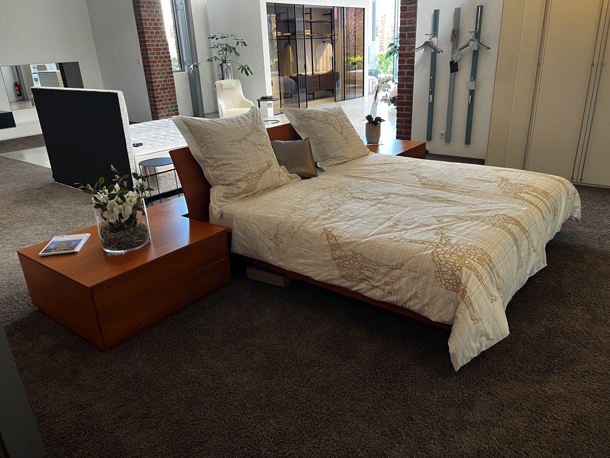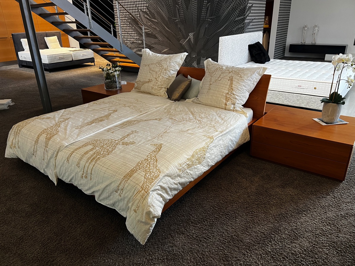 Ein luxuriöses Ensemble in warmem amerikanischem Kirschbaum, veredelt durch feine Edelstahl-Applikationen. Das Bettmodell 2500 begeistert mit einer sanft gerundeten Rückwand und eleganten Proportionen. Ergänzt wird es durch zwei Nachtkommoden und ein harmonisch abgestimmtes Sideboard.
