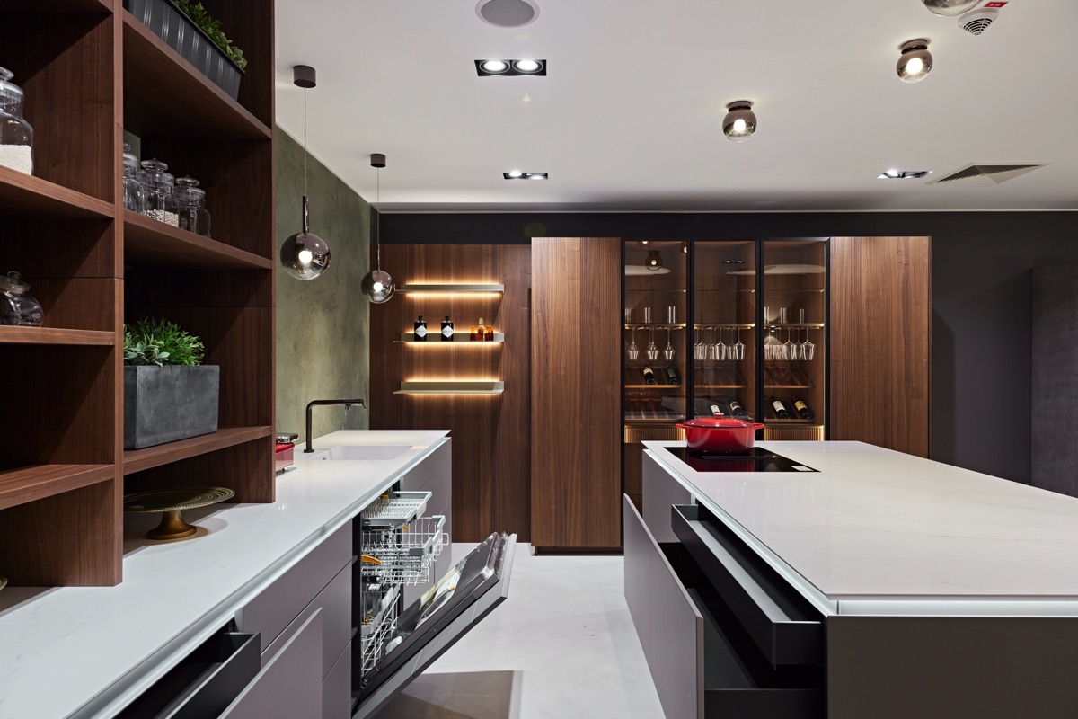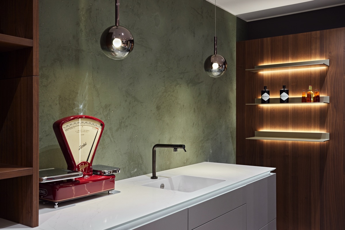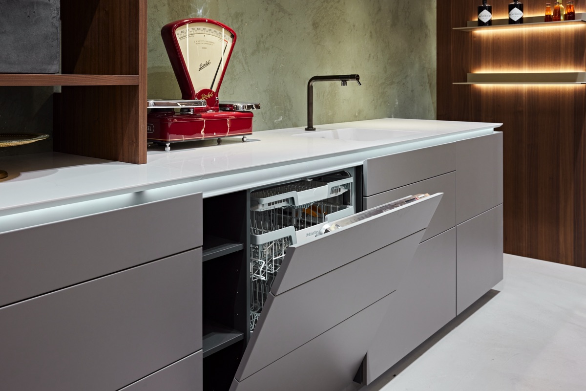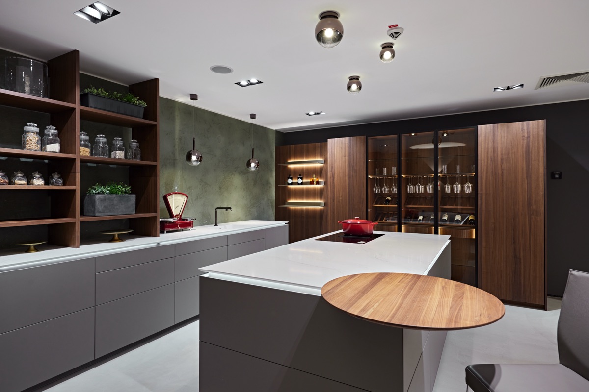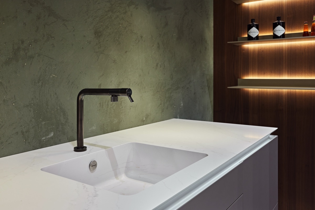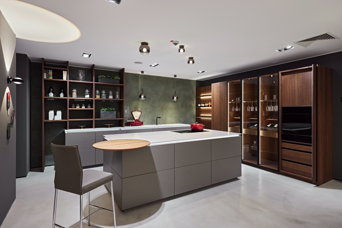 Diese LEICHT Küche vereint puristisches Design mit höchster Handwerkskunst. Mattlack-Fronten und eine feine Schweizerkante verleihen ihr eine außergewöhnliche Leichtigkeit und stilvolle Eleganz. Das Zentrum bildet ein massiver Steinblock, aus einem Stück gefräst – ein echtes Unikat und Statement zugleich.