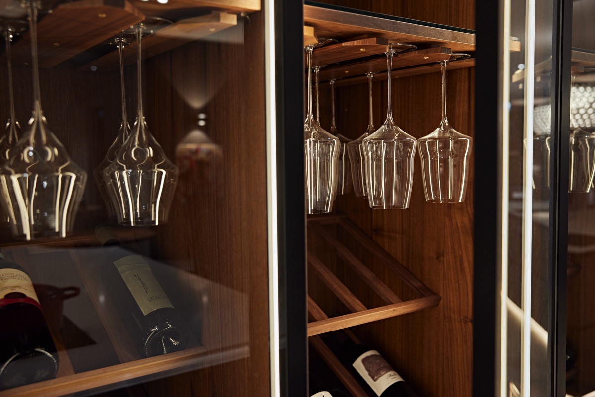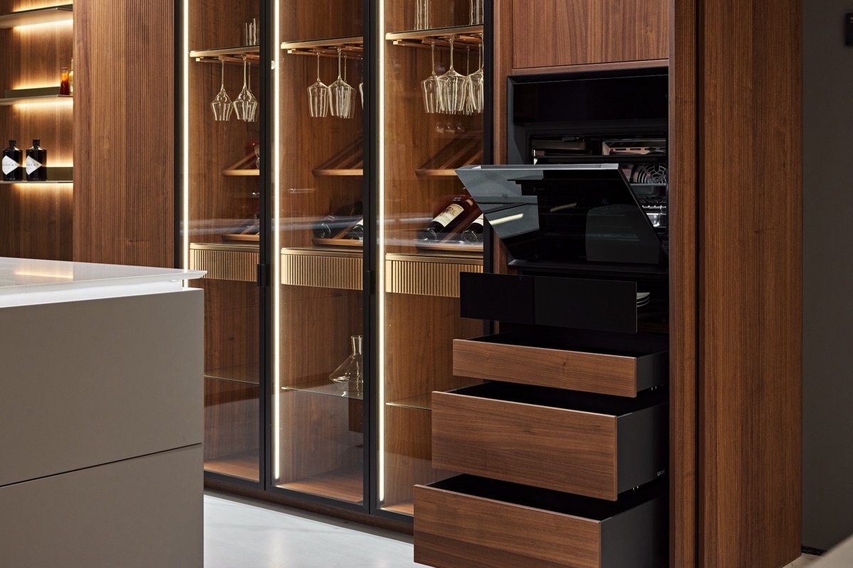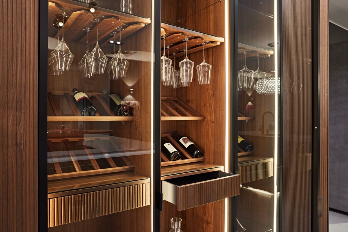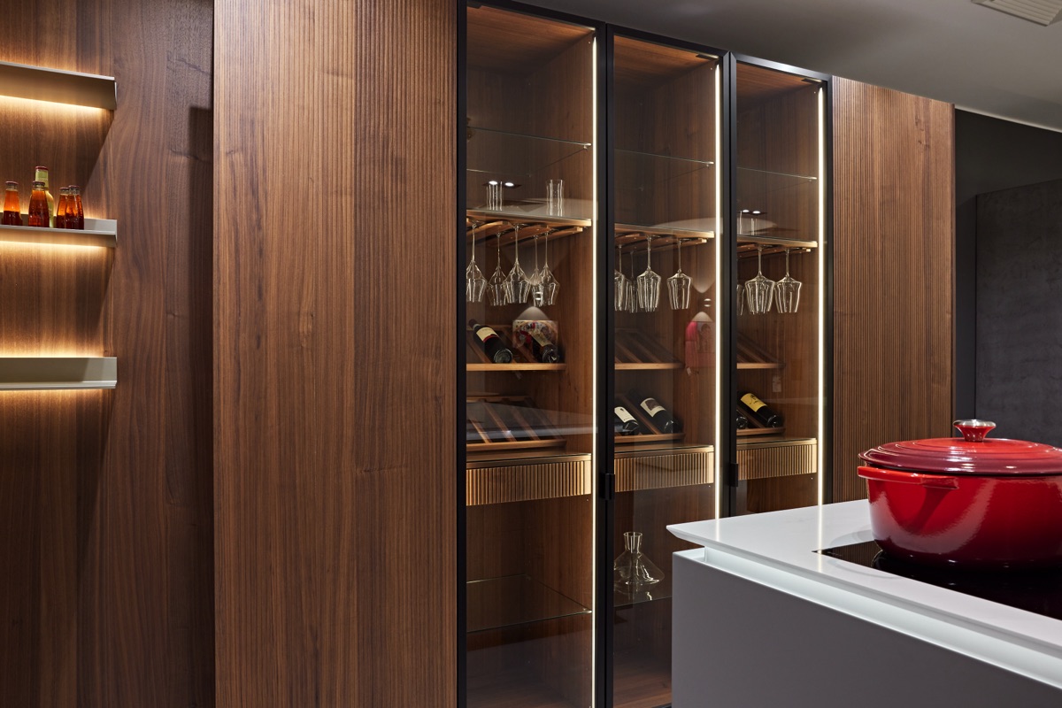 Ausgestattet mit hochwertigen Geräten von Bora, Miele, Liebherr und Gessi, erfüllt sie höchste Ansprüche an Funktion und Ästhetik. Das LEICHT Stollenregal und das durchdachte Occhio Lichtkonzept runden das Gesamtbild harmonisch ab und setzen beeindruckende Akzente.