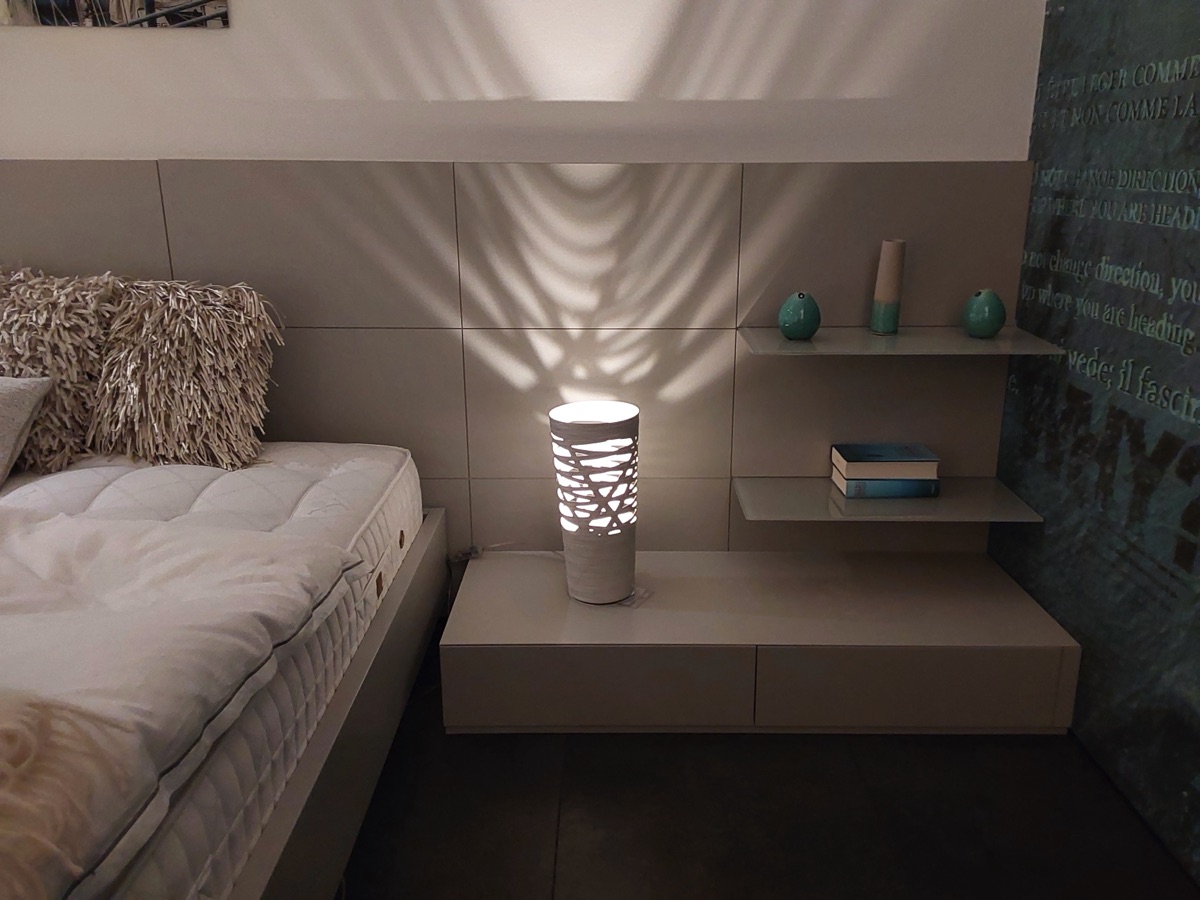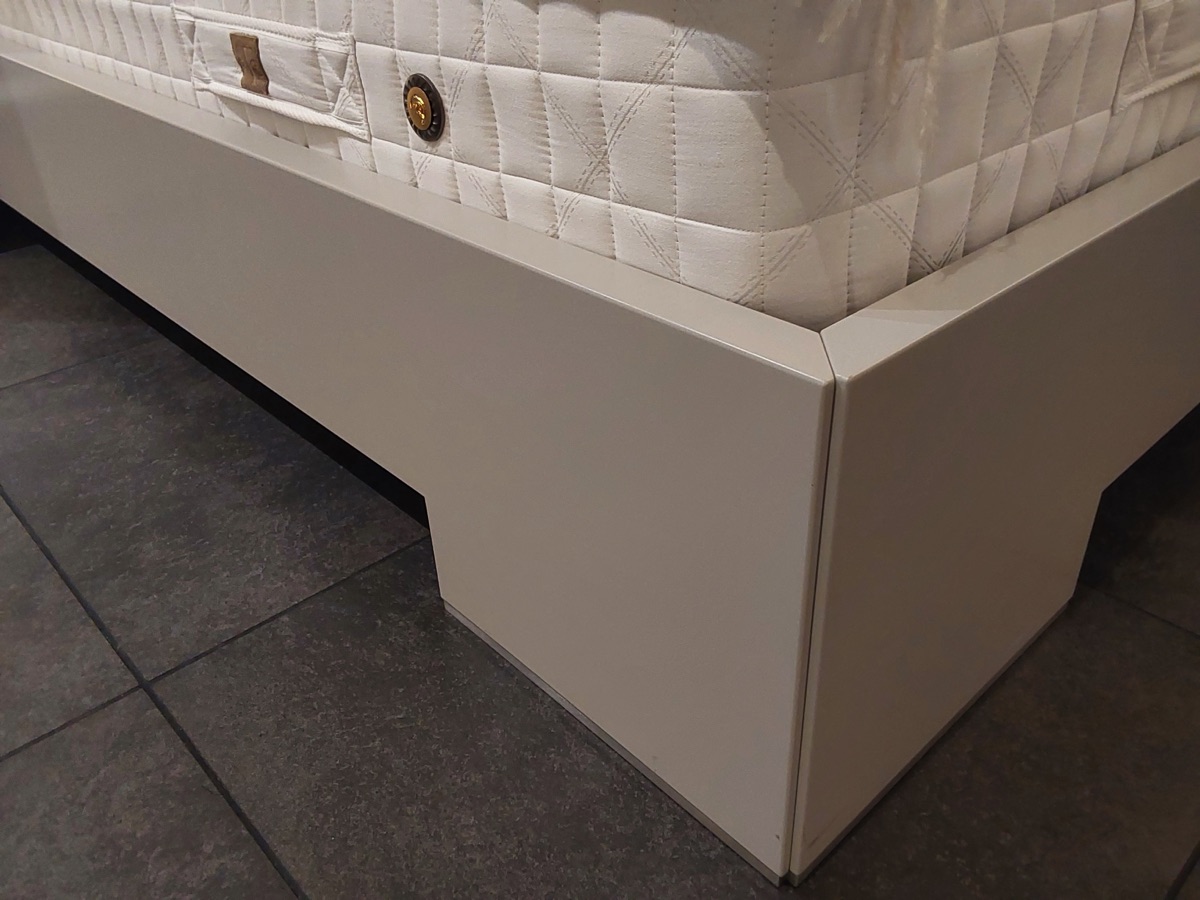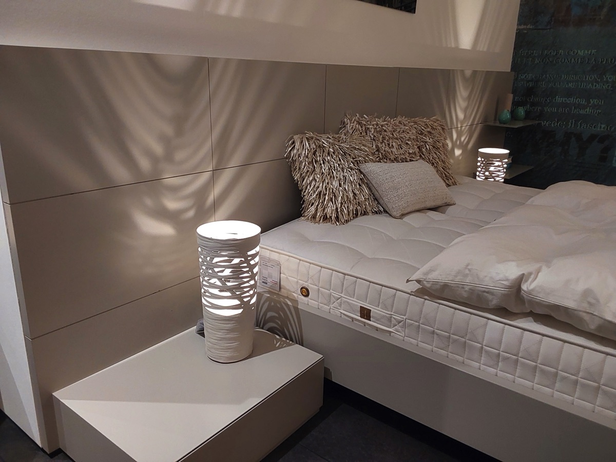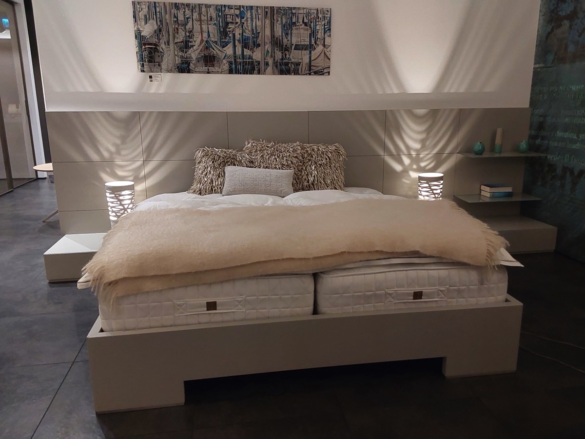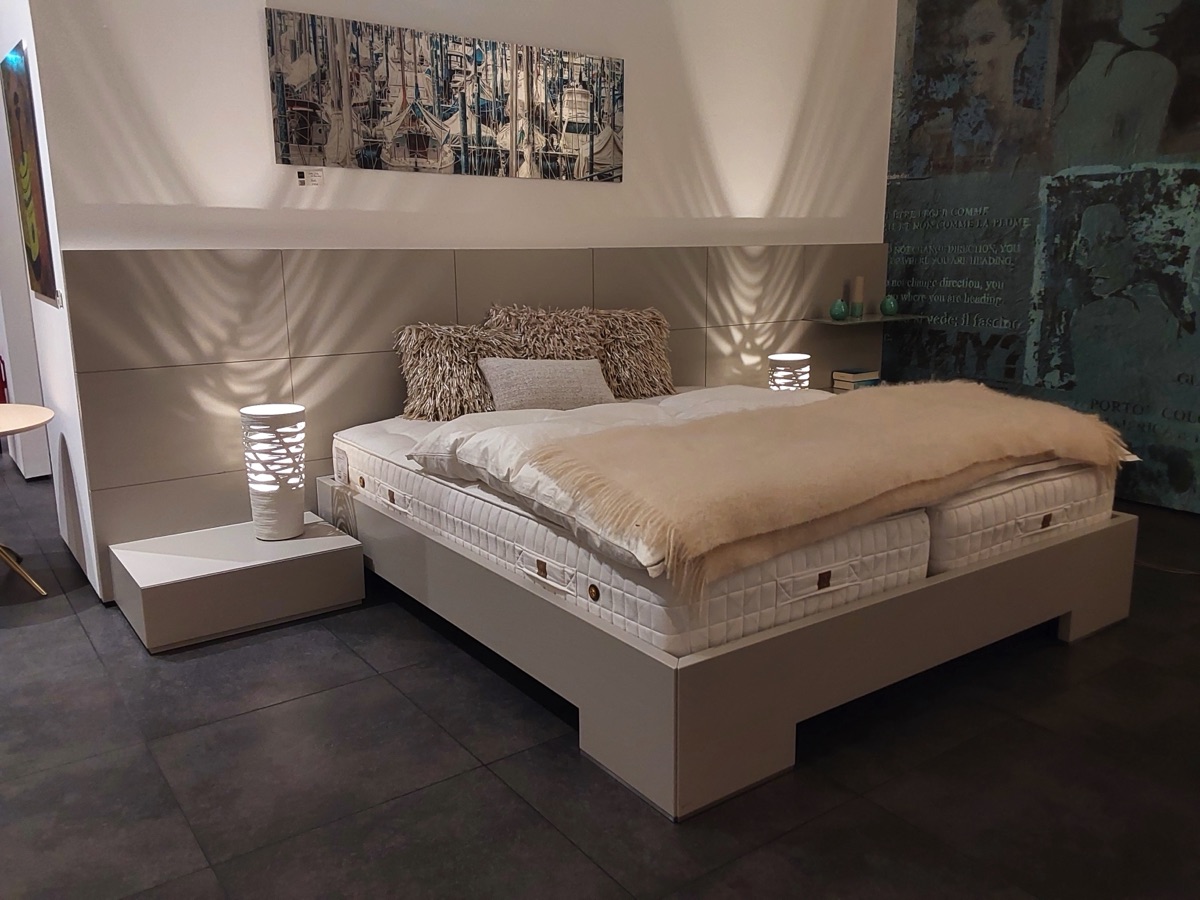 Edles Design in Mattlack Tortora chiaro: Ein Rückwandpaneel mit feinen 3-mm-Ziernuten in horizontaler und vertikaler Ausführung, ergänzt durch extraweiße, von unten lackierte Glasböden. Die Gehrungsschränke folgen derselben klaren Linie – mit Legrabox Terraschwarz Schubkästen und push-to-open Komfort. Abgerundet wird das Ensemble durch das Bett Modell 9000, Materialstärke 38 mm und einer harmonischen Standardhöhe von 345 mm.