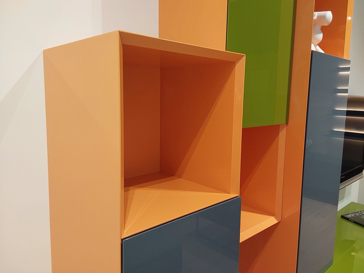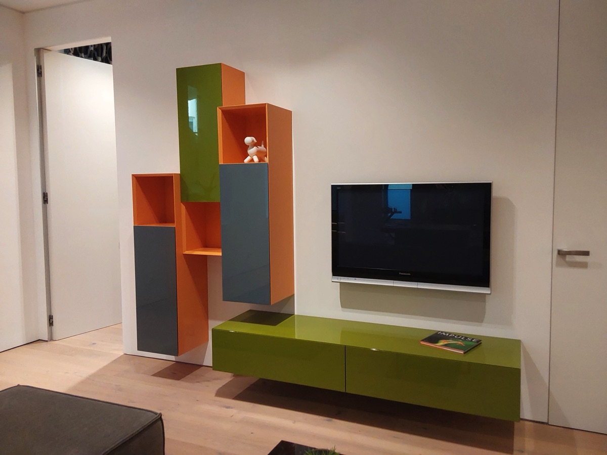 Eine elegante Wohnwand voller Charakter: Hochglanzflächen in Mandarina, Oliva und Grigio setzen markante Farbakzente, während der Korpus in passendem Mattlack die Komposition harmonisch abrundet. Ein edles Statement – modern, lebendig und stilvoll zugleich.