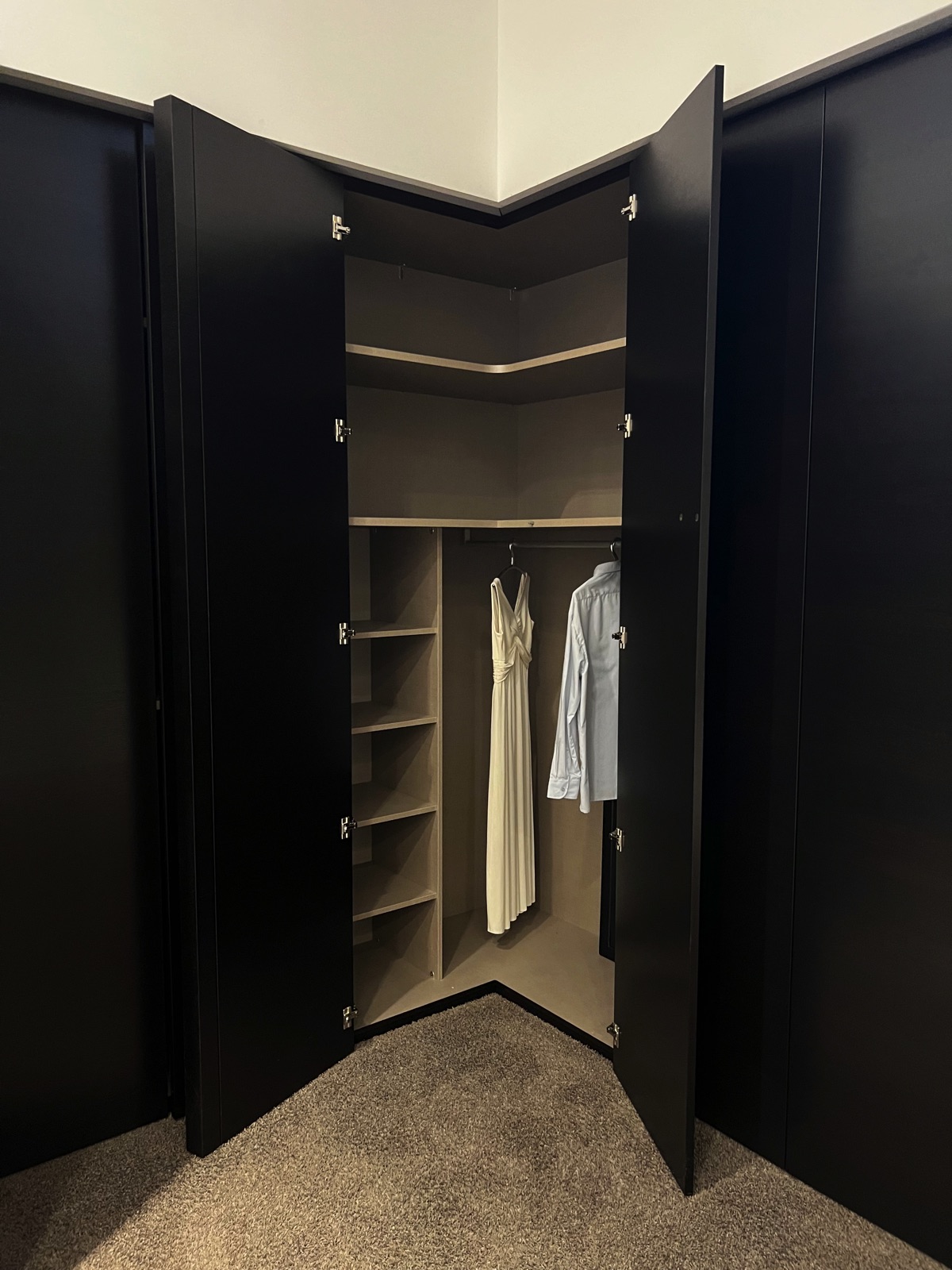 Eine individuelle Stauraumlösung in feinster Schreinerqualität: Der Eckeinbauschrank in querfurnierter Eiche Tabak kombiniert warmes Holzbild mit flächenbündiger Push-Öffnung. Die großzügige Inneneinteilung mit Kleiderlift und maßgenauer Verarbeitung schafft exklusiven Komfort für anspruchsvolle Interieurs.
