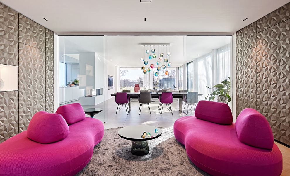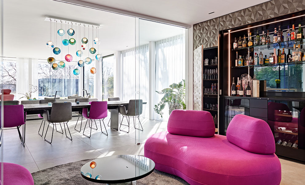 Die gemütliche Sitzlandschaft findet ihren Platz inmitten der maßgefertigten Schrankanlage, die fließend in den Raum integriert ist. Hier findet sich unter anderem die Bar mit modernsten Weintemperierschränken. Die Auswahl an Getränken rückt vor der Spiegelrückwand in Szene und wird durch die LED-Linienbeleuchtung mit eingefrästem Aluminiumprofil und Streuscheibe ins richtige Licht getaucht. Aus Reliefplatten setzen sich die Fronten zusammen. Die Doppeltüre wurde als Dreh- und Einschubtür verbaut und verfügt über ein elektromechanisches Öffnungssystem.
